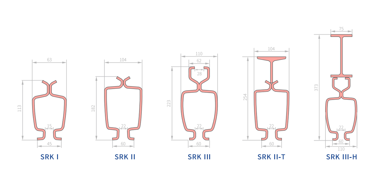 | SRK II-T | Thép nhẹ cường độ cao | 26,6kg/m | 33,88cm2 | 2380cm⁴ | Không được trang bị đường ray cố định | Biểu đồ sau | Kích thước tùy chỉnh | RAL2002 |